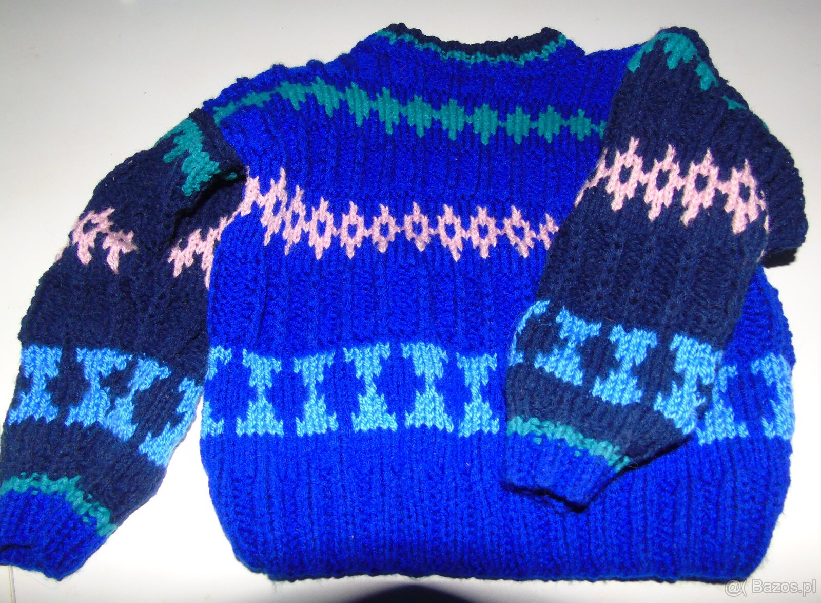 Sweterek ręcznie wykonany, nowy. Dł.36 cm, szer. 32 cm. Dł. rękawa wraz z ramieniem 37 cm. Wiek dziecka ok. 3 lat.