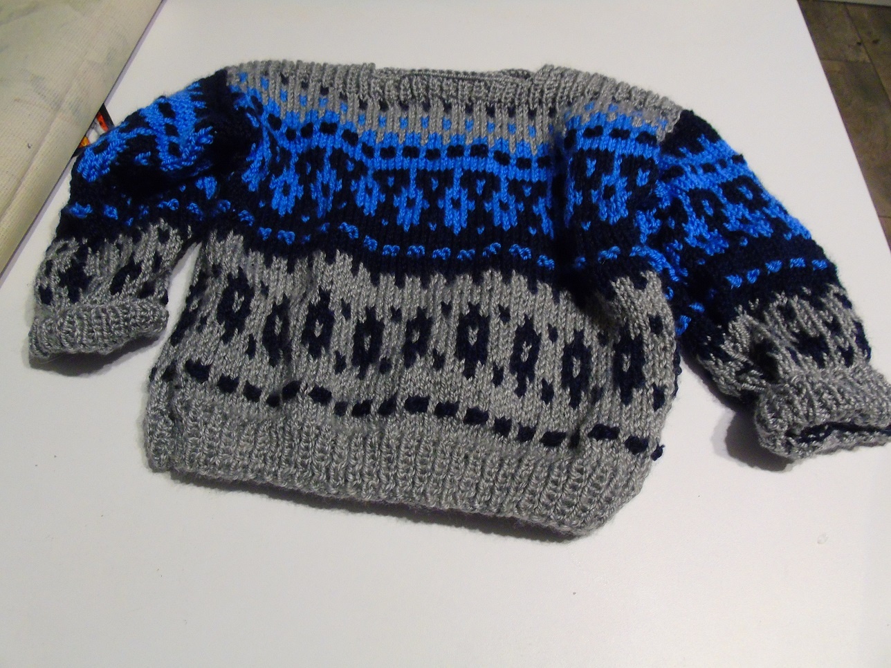 Sweterek - [11.2. 2026]Sweterek ręcznie wykonany, nowy. Dł.36 cm, szer. 32 cm. Dł. rękawa wraz z ramieniem 37 cm. Wiek dziecka ok. 3 lat.