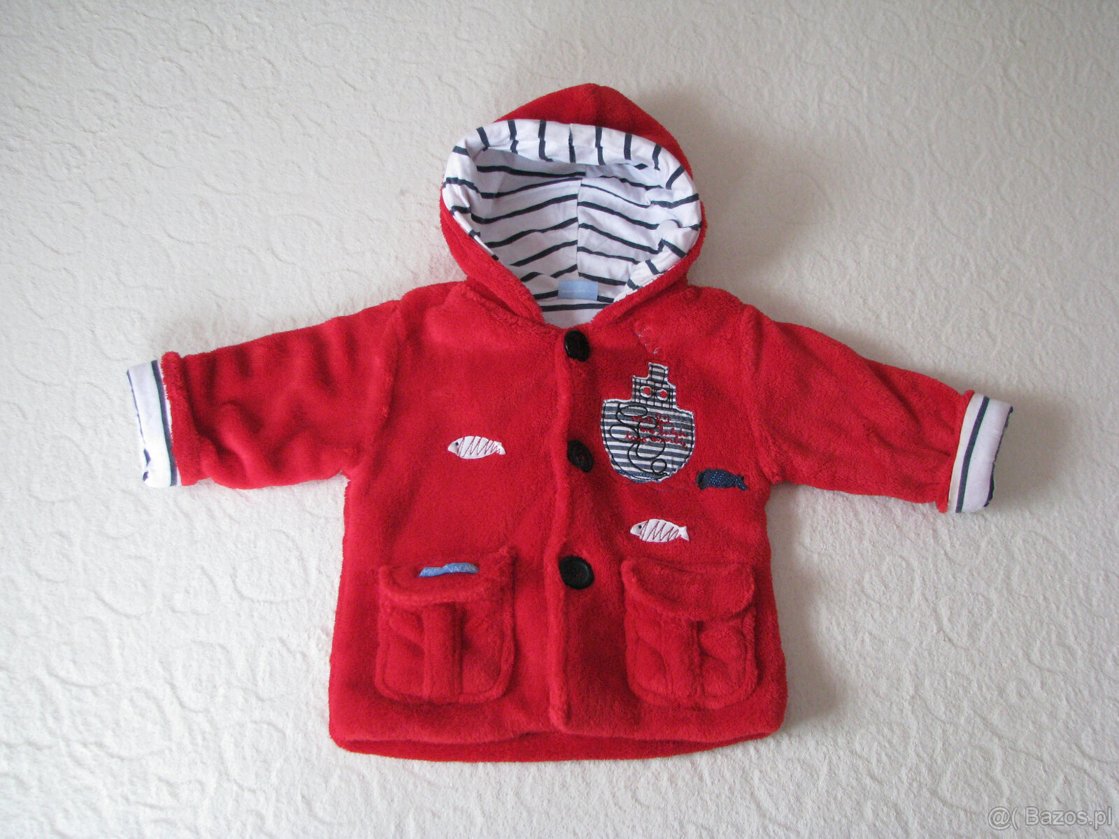 Wykonana jest z dobrego gatunkowo, oddychającego i przyjemnego w dotyku grubego miśka, podszyta materiałem bawełnianym w kolorze białym w granatowe paski – jest bardzo milutka :) Ładnie wygląda z wywiniętymi rękawkami. Zapinana jest na guziki, posiada dwie zewnętrzne kieszonki z klapką oraz kaptur, podszyty tak, jak cała kurteczka, na przedzie kurtki umieszczone są ozdobne naszywki, które dodają całości uroku.