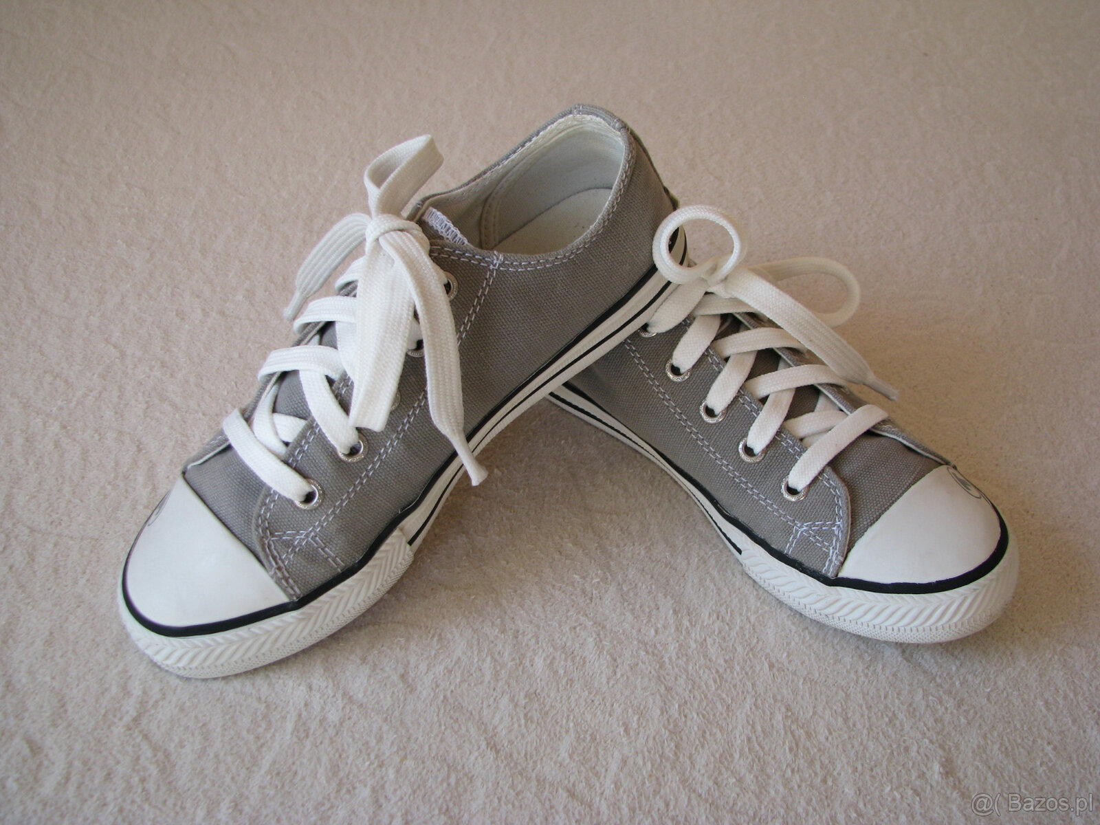 Obuwie wykonane jest z mocnej tkaniny bawełnianej w kolorze jasno-popielatym. Czubek buta biały, gumowy, wnętrze buta białe, tekstylne, wygodna, elastyczna, gumowa podeszwa zapewnia doskonałą przyczepność.
