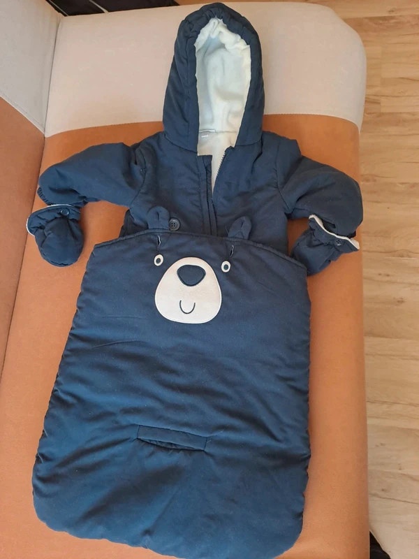 Śliczny dwucześciowy kombinezon dla niemowlaka rozmiar 62, na 3-6 miesiecy firmy Fagottino. Osobno jest kurreczka z kapturkiem i rekawiczkami. Osobno jest dół na nogi dziecka. Moze razem służyć jako kombinezon do przenoszenia do samochodu i na spacery.